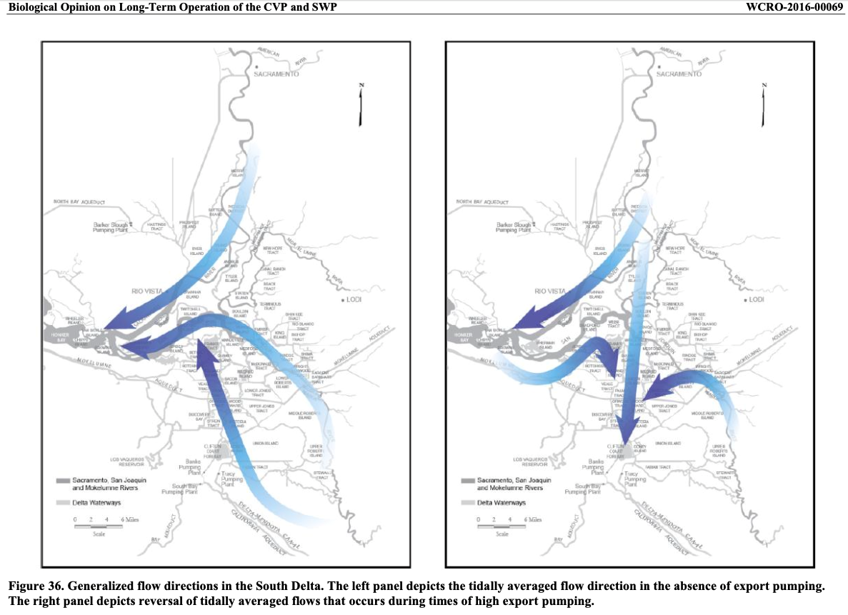 Figure showing flow direction in the South Delta. Credit: the Biological Opinion on the Long Term Operation of the Central Valley Project and State Water Project.