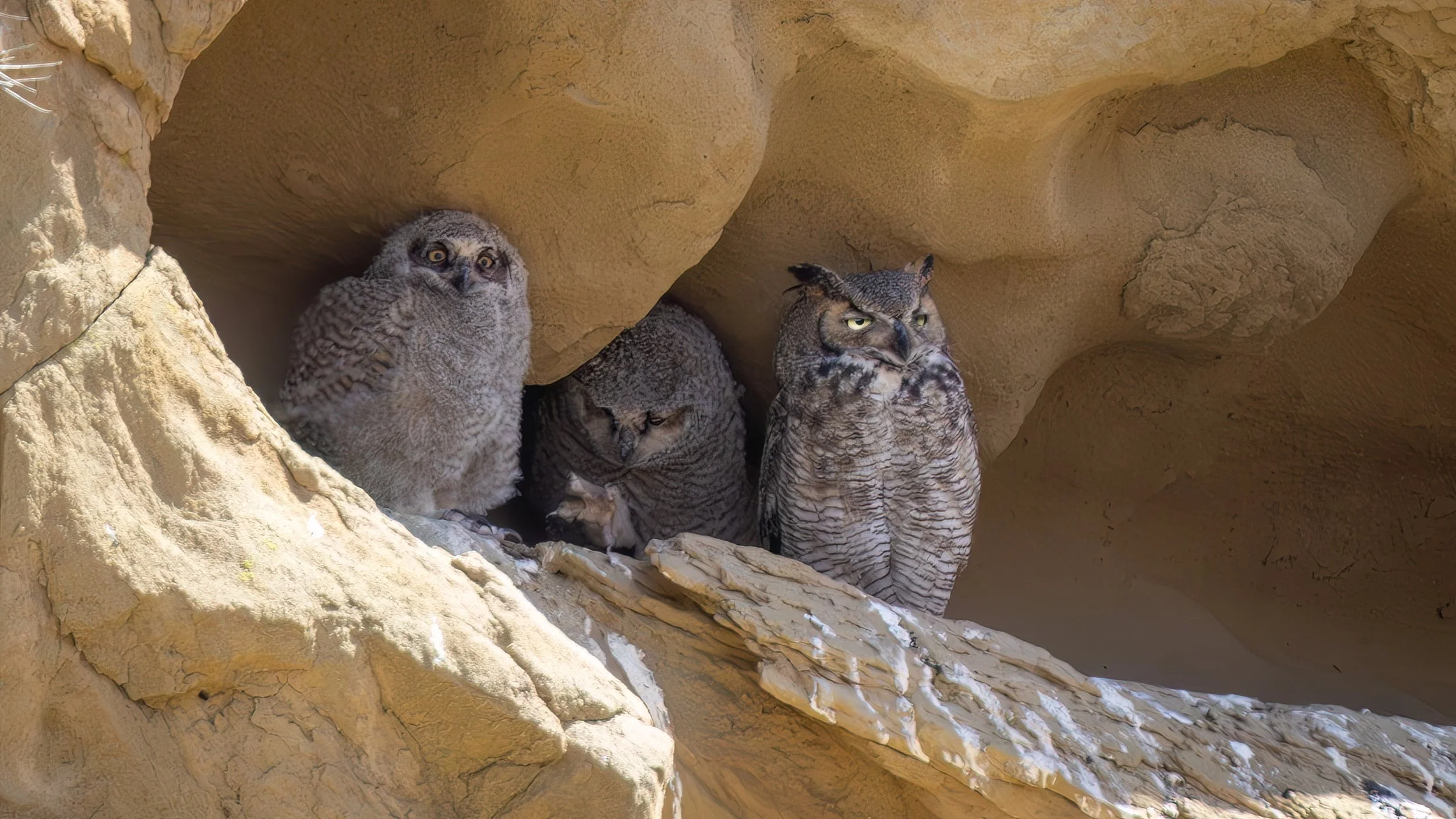Del Puerto Canyon is home to a variety of wildlife, including this Great Horned Owl family. Credit: Jim Gain, May 7, 2025.